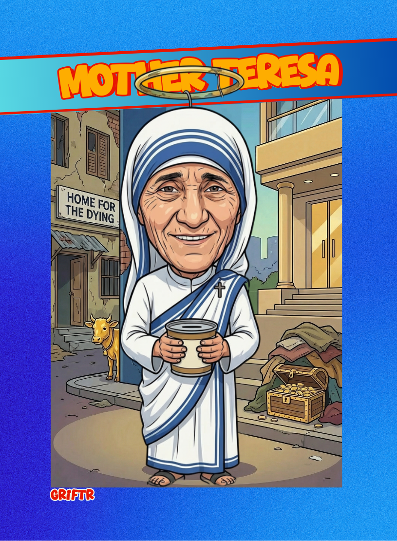 Mother Teresa cashed hundreds of millions for her foundation, but all is not as it seems. Her facilites were known to be dirty with patients sharing beds and needles. Her grift was next level and tragic.